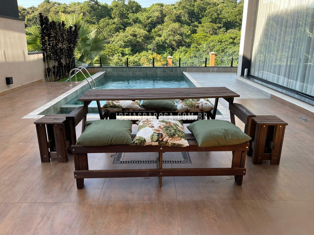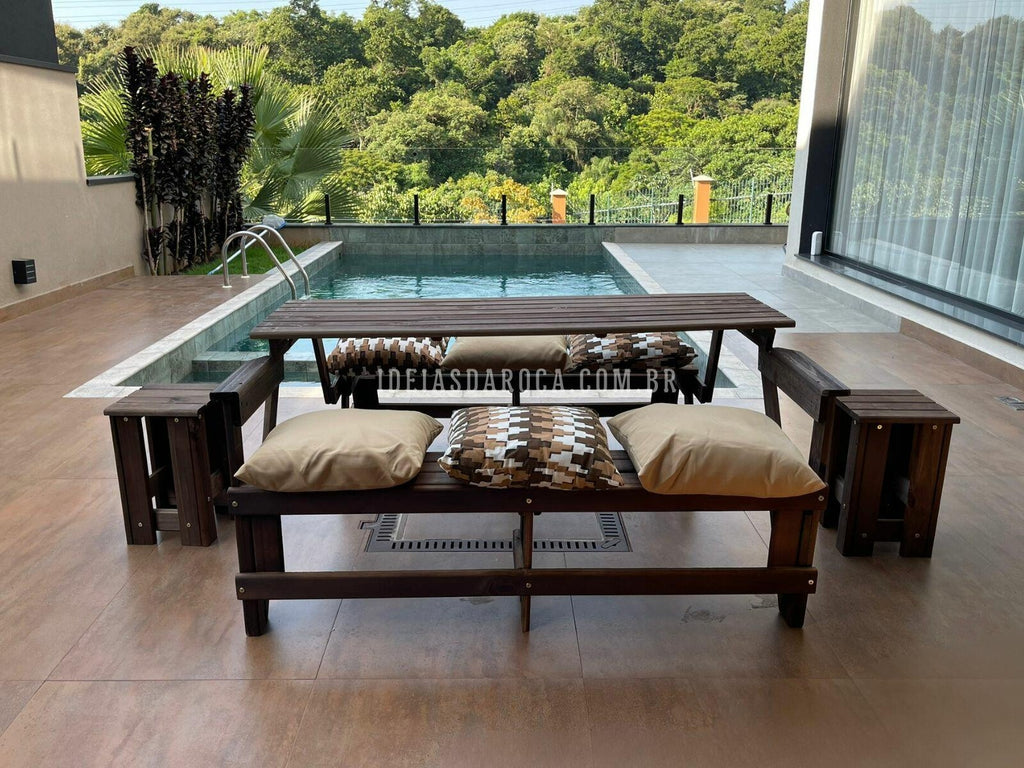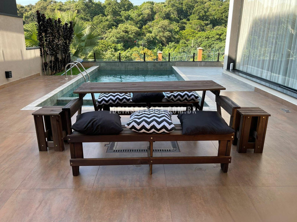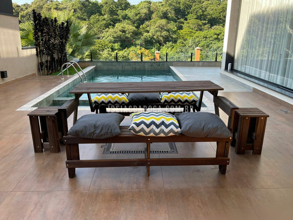 Combo Banco Que Vira Mesa 6 lugares + 2 mesas de centro + 6 almofadas.