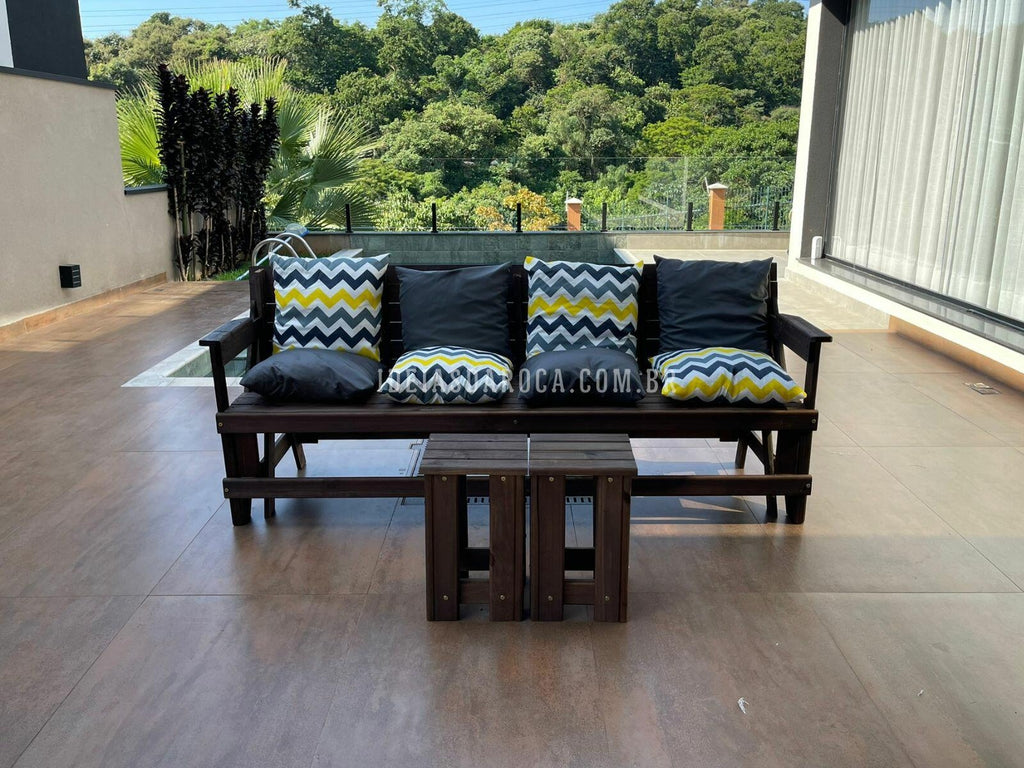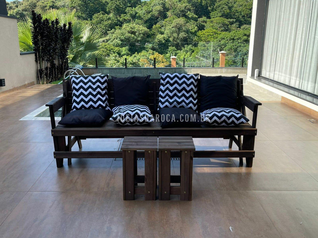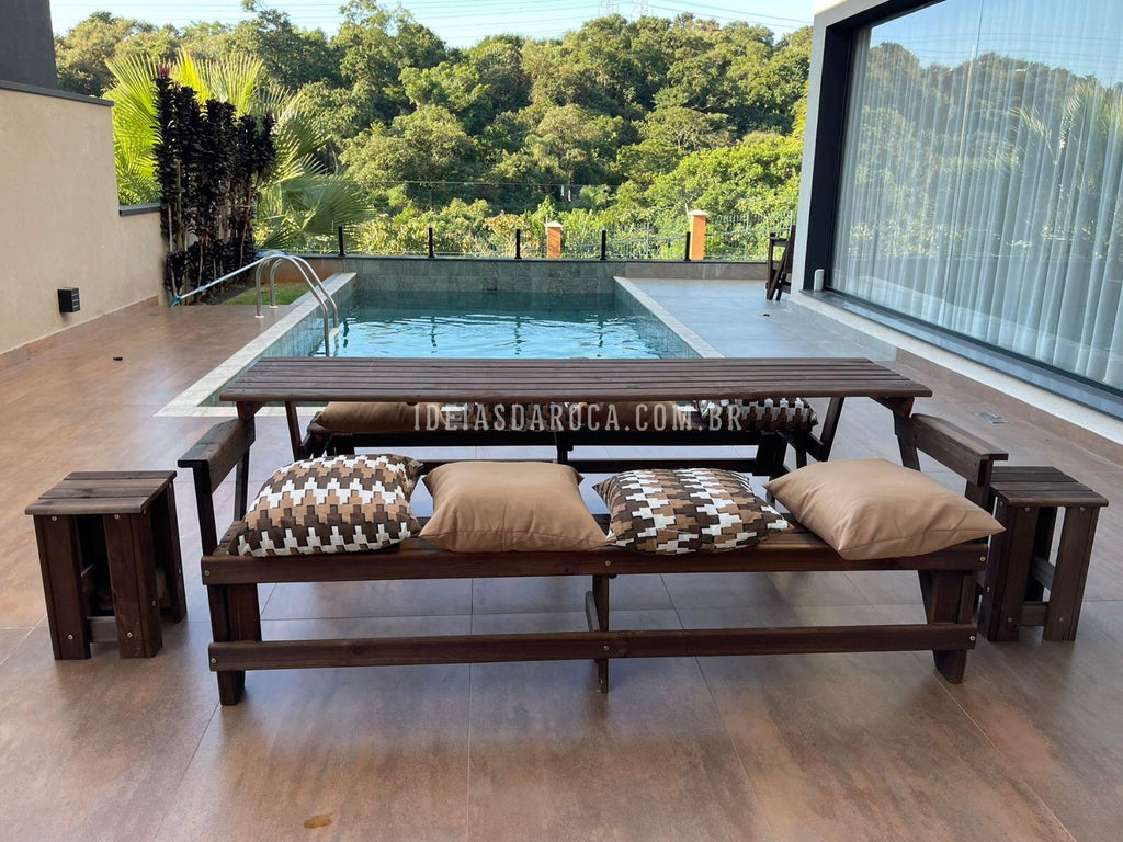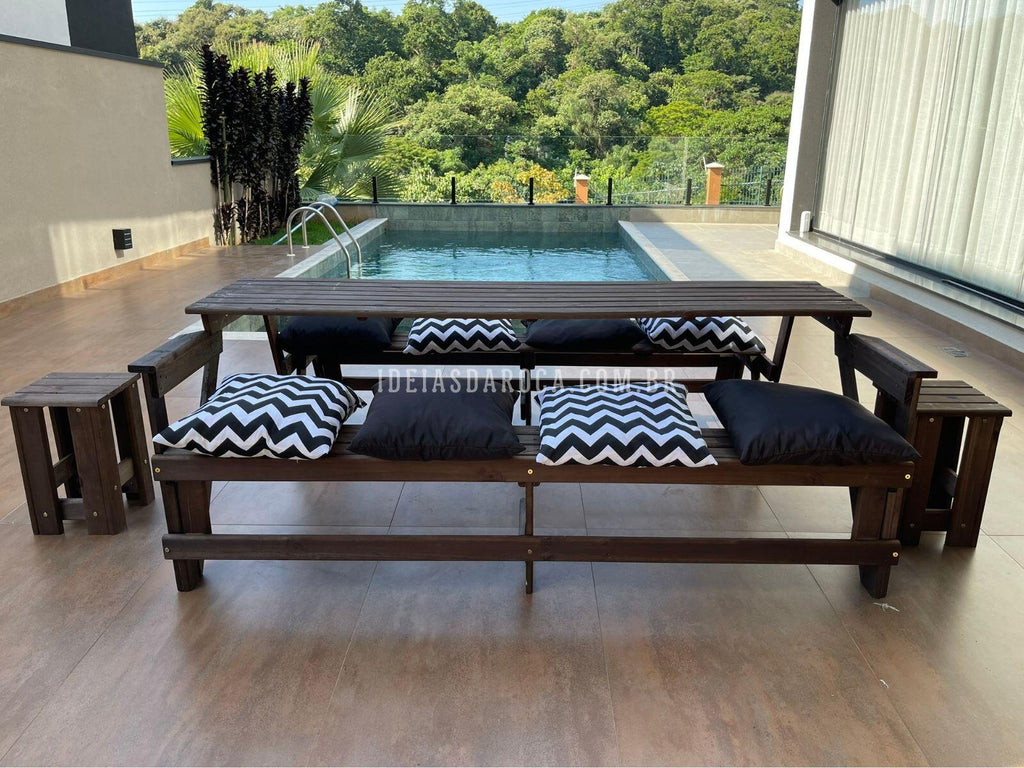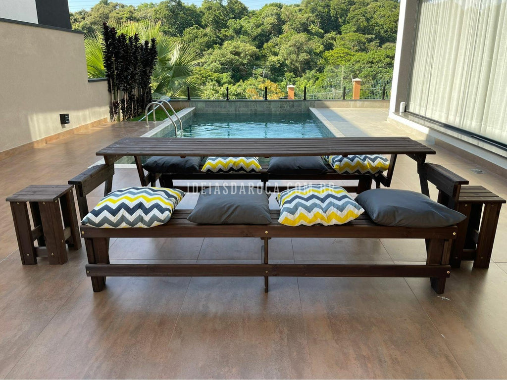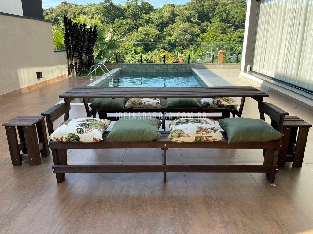 Combo Banco Que Vira Mesa 8 lugares + 2 mesas de centro + 8 almofadas.