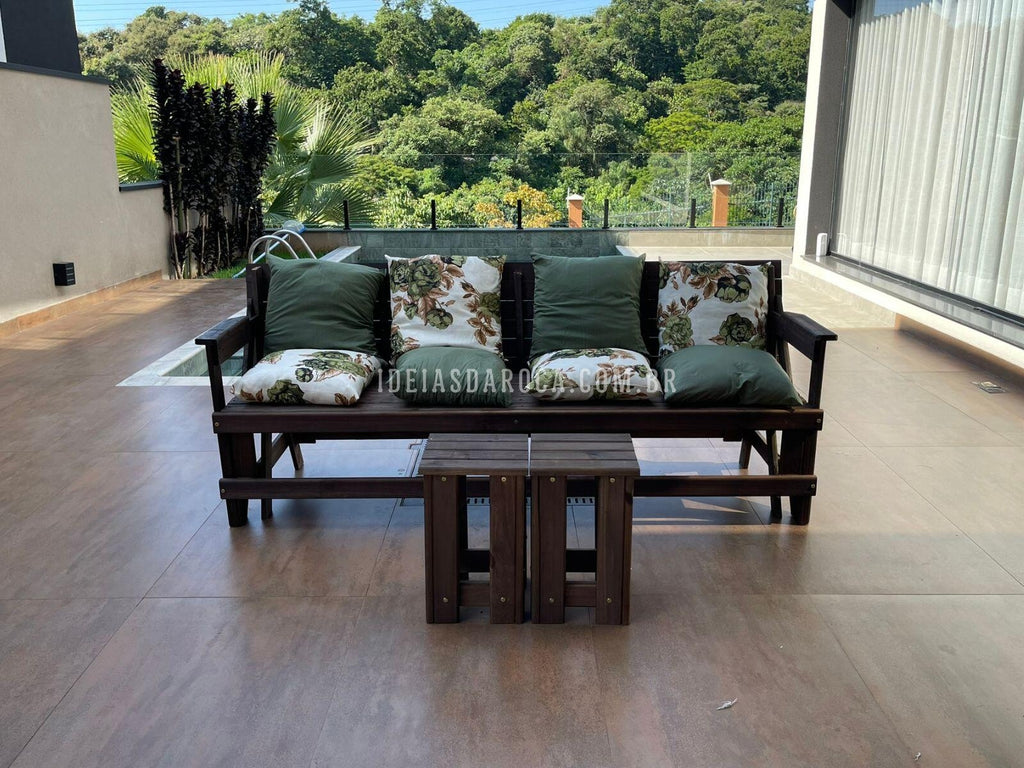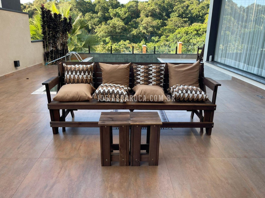 Esse combo acompanha 2 mesas de centro e um conjunto com 8 almofadas.