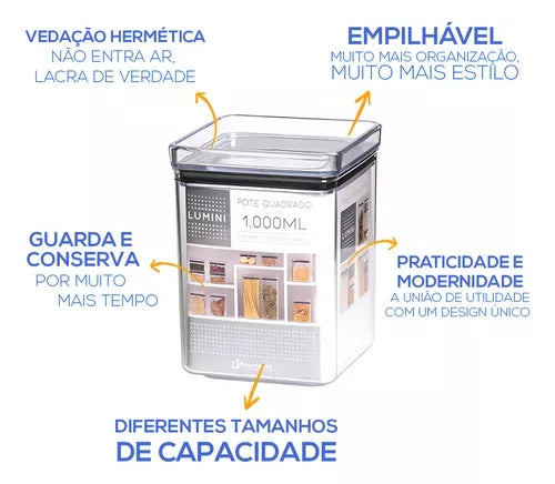 O Kit Potes Mantimentos Hermético Quadrado Cozinha da Paramount é a solução perfeita para a organização e conservação dos seus alimentos. Este conjunto exclusivo é composto por potes de acrílico de alta qualidade, resistentes e com vedação hermética, garantindo que seus mantimentos fiquem protegidos e frescos por mais tempo. A vedação de silicone assegura que o conteúdo esteja seguro contra umidade e outros agentes externos, mantendo o sabor e a qualidade dos seus alimentos.